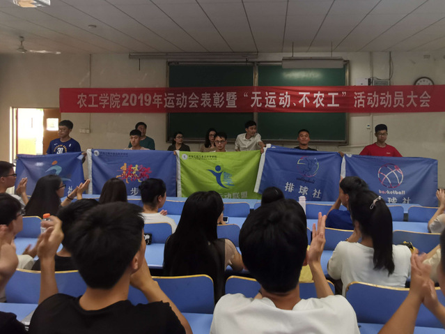 随后,与会老师为“农工运动联盟”、足球社、篮球社、排球社、跑步社授旗。