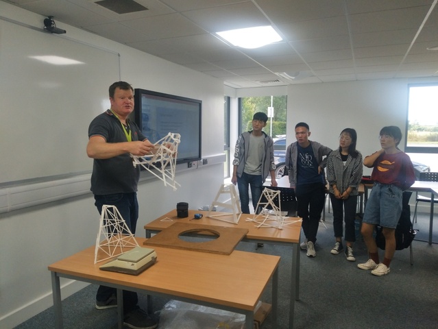 下午两点访学团师生来到AEIC学习g classes。Chris Waghorn老师讲述了设计的概念及世界各地著名的塔,随后给我们布置了任务,即用热熔胶和纸棒搭一个高度300mm,可以承重1Kg的塔。