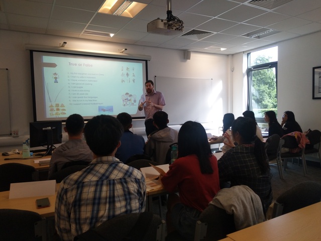 上午是英语课,Martin老师非常的热情,幽默,专业。前两节课内老师先自己做自我介绍,自我介绍的方式 非常的独特,有趣,给我们留下了很深的印象。之后老师要求大家按照他自我介绍的方式每个人站在讲台上进行自我介绍。整个过程非常的愉快顺利,同学们与老师的关系很快就拉近了。