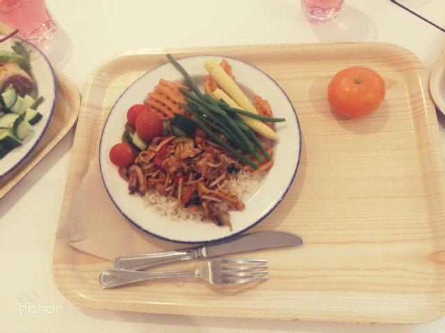 12:30,结束英语课程后,饥肠辘辘的同学们来到餐厅吃午餐。今天的午餐有点特别,因为我们尝到了“中国味道”,主食中有一道菜“蔬菜面条”,吃起来类似我们的小炒,大家都很喜欢。