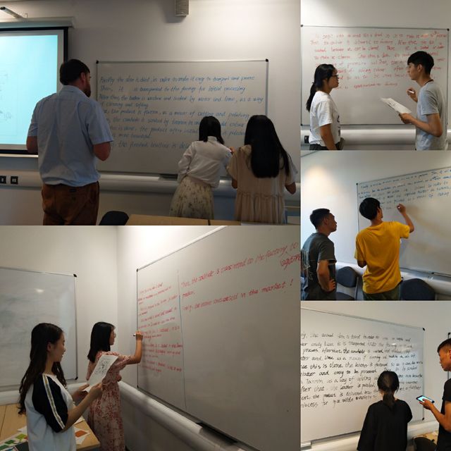 然后,为了下周五的个人展示更加顺利的进行,Martin老师给我们讲了写学术报告中需要注意的问题。并且,以奶牛加工皮鞋的过程为例,两人一组,讨论后在各自的黑板上写下各组的讨论结果。