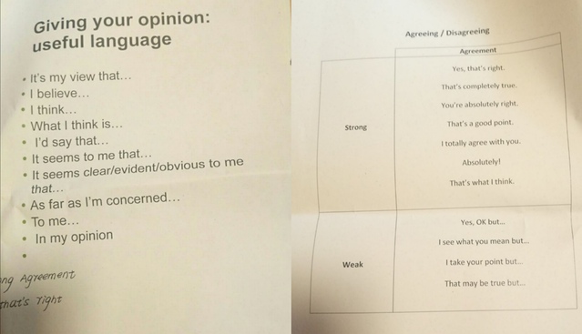 大家吃过早饭后,当地时间9点来到教室,总结昨天讨论的内容,为上课做准备。在课堂上,首先,针对昨天的热气球问题。老师教给我们如何合理地表达自己的观点,当我们同意或者是反对别人观点时,又应该怎样表达。