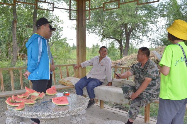 在果园占地1500亩的西吉尔镇,实践团队与老果园生态农场的杨庄主进行了解交流,同时品尝当地的原生态西瓜。杨庄主讲到,当地果园栽培和保养人工费用偏贵,但是市场几近饱和,依靠政府农机政策补贴缓解近期压力。在农机经销商购买机器,从法国进口机器质量偏好但回本慢,国产机器回本快,同时质量也在不断提高,大多选用国产农机。在同杨庄主的交流中,实践团队结合所学专业知识对当地农业机械的整体利用提出建议,有利于当地农业机械的全面发展。相比10年前,当地的灌溉渠道更方便,节省大量人力物力,杨庄主最后说到,政府批下5万元经费,七月份鼓励当地人员去美国参观学习。