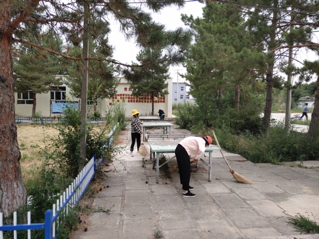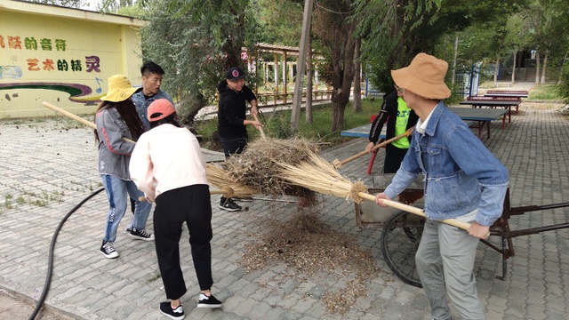 早餐结束后,队长盛祥振清理并分发清扫工具。团队将公司分为四部分,男生女生合理使用可用工具,同时进行打扫。实践团全体成员共分为三队,五人扫主路,四人在前队后方做细致的清扫,四人清理运送垃圾。从宿舍院子开始,将落叶、松子扫到花坛里,叶落归根,将垃圾用小推车运到垃圾车。各小组之间配合默契,小组成员之间互相帮助。先将宿舍小院打扫干净,然后从宿舍门口,一路向北,将校园主路打扫干净,主路上松子较多,团队成员用大扫把、手捡等方法将松子运到花坛,主道大约用时两小时。后又将举办“红领巾小课堂”活动的教室进行物体归整,将书桌恢复原位,打扫干净教室,为孩子们维护好良好的学习环境。
