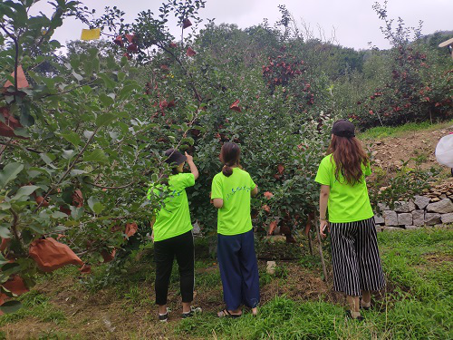 参观果园过程中,志愿者们与该地负责人积极交流,得出造成当地苹果减产的一些原因:一、井内的水凉,不及自然雨水的效果好;二、天气干燥,苹果易自行脱落,且空气冷,苹果发育不好,易长成畸形果;三、授粉不足:今年干旱,农药成分含量高,对当地的蜜蜂有所影响,造成其中毒死亡。且养蜂人带来南方蜜蜂,比当地蜜蜂体型大,会咬死当地蜜蜂。综合以上问题,志愿者们积极与当地负责人进行交流,希望找到一个恰当的方式来解决这些问题,从而确保老百姓的苹果收入。