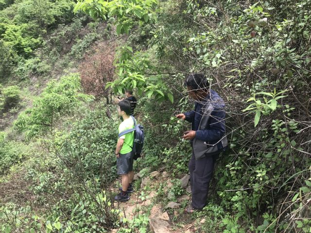 首先,毛泽忠开车带领实践团成员前往此次验收地点。毛泽忠实践团成员分为两组,分别跟随2队队长、7队队长前往山林巡查作物生长情况,验收各此次退耕还林计划的进展状况。前往耕作地的山路十分狭窄,坡度较大,实践团成员顶着烈日,小心翼翼地在没有路的山地间行走,向着验收地缓慢前行。
