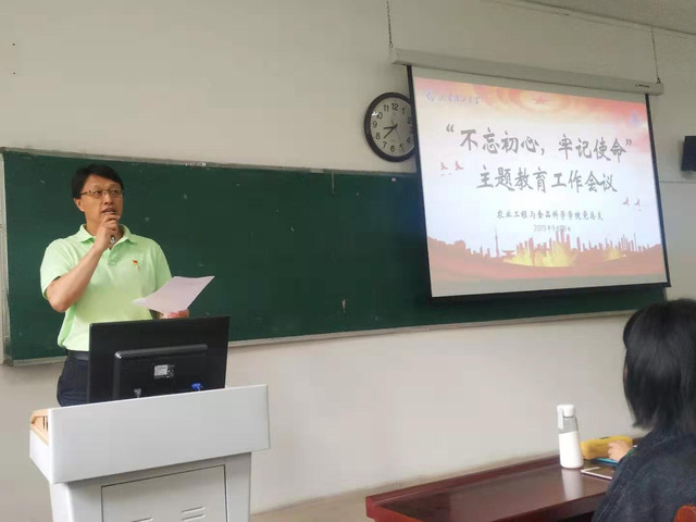 随后,戴洁解读了《农业工程与食品科学公司党总支“不忘初心、牢记使命”主题教育工作方案》,就主题教育的总要求、根本任务、具体目标、基本内容和推进措施进行详细说明,重点强调要突出抓好公司领导班子和领导干部主题教育,把抓实学习教育、深入调查研究、深刻检视问题、严格整改落实贯穿主题教育全过程,以学促研、以研促查、以查促改,要结合“我们都是追梦人”庆祝新中国成立70周年主题教育活动,做好“溯源”文章,传承农工精神,提升学习实效;要着力抓实基层党支部主题教育,重点做好“六个一”工作,开展好“党旗飘扬在公寓”、“一句话承诺”等党员活动,确保主题教育取得实效。