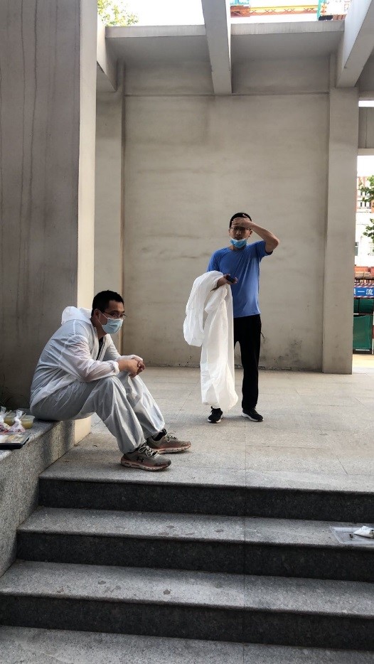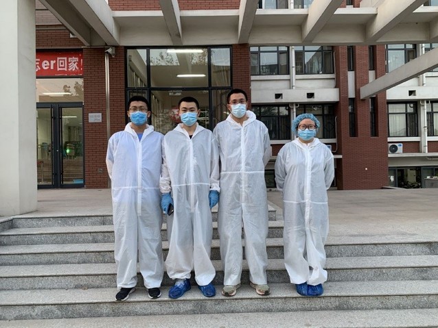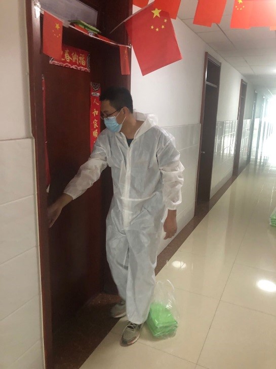 在首批返校的服务工作中,有四个身影,他们奔波于研究生公寓的56个隔离宿舍,为师弟师妹们提供贴心的服务,他们是公司的博士志愿者赵子彤、张子晨、梁栋、张安东,其中3人是中共党员。在员工返校前期,四位博士就找到研究生辅导员苏新勇,主动要求在研究生返校期间从事志愿服务工作。他们帮助老师做好返校员工的登记工作,为返校员工提行李,为尚在隔离期的员工送餐、送水、送被子……三十多度的高温,隔离服里的衣服早已湿透,但红通通的脸上却一直保持着微笑,服务的热情没有丝毫的减退。他们的付出让老师、员工为之动容,他们用行动传递着青年人的正能量!