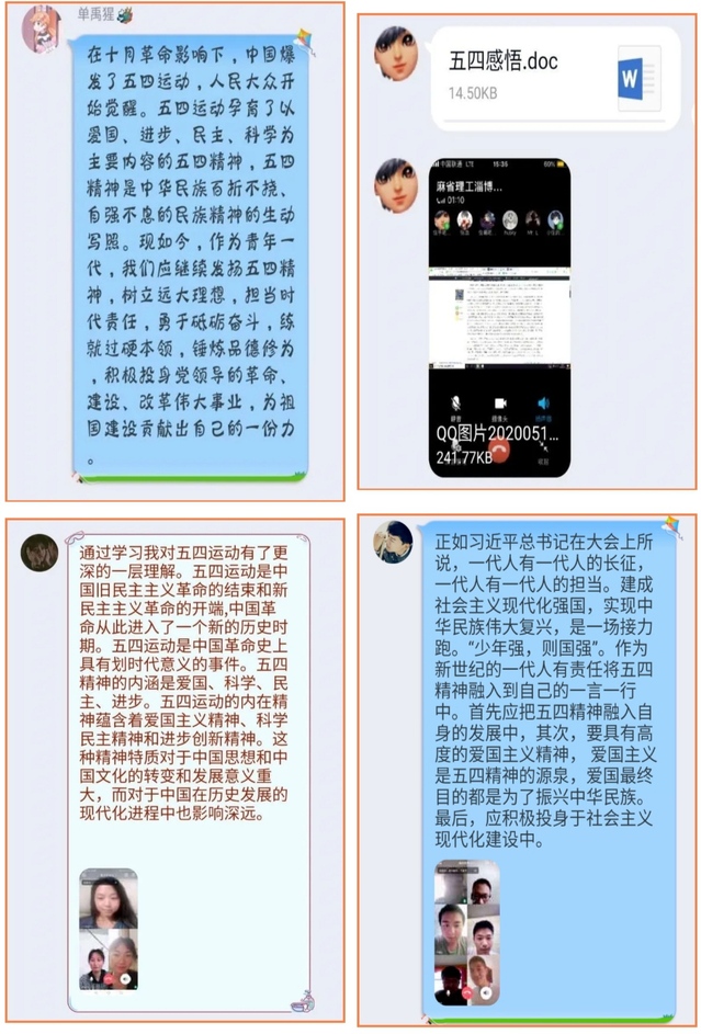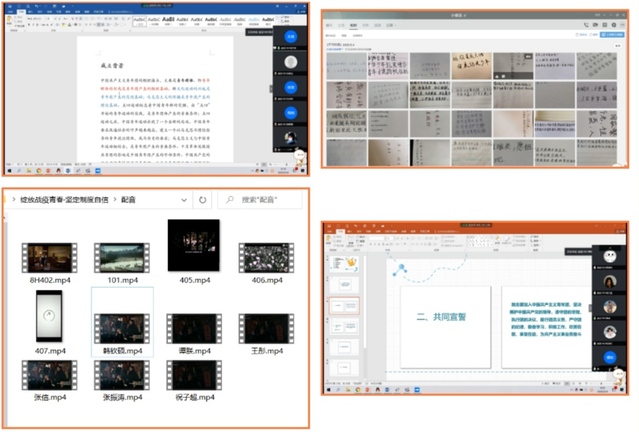 同学们学习了习近平总书记在纪念五四运动100周年大会上的重要讲话。打开麦克风,一同重温宣誓誓词。参加了人民网新媒体平台的“我们都是收信人”活动。支部成员自行录制了团歌,完成了一次“云”合唱;支部成员自行选择观看《建党大业》、《建国大业》等具有历史意义、积极向上的影片,并以宿舍为团小组自行选取片段,再深入理解的基础上进行配音。青年团员自主运用历史的长镜头、广角镜深入学习五四运动精神内涵和历史意义。