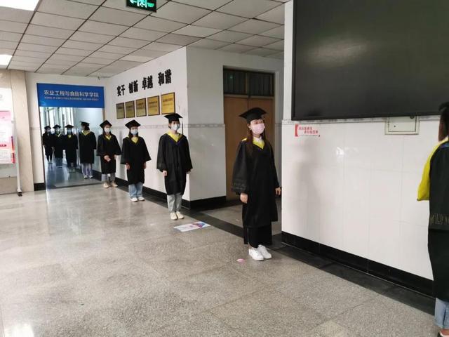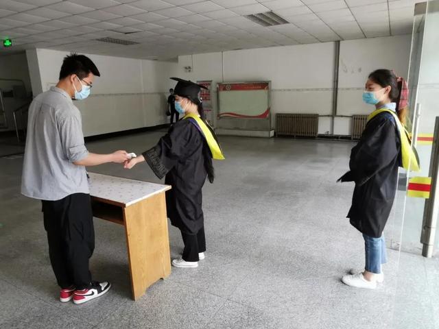此次学位授予仪式按照疫情防控要求进行,为确保师生健康安全,毕业生需经12号教学楼南大厅门口测温无异常,佩戴口罩,消毒后进入走廊,按地标间隔2米排队进入北大厅学位授予仪式现场。