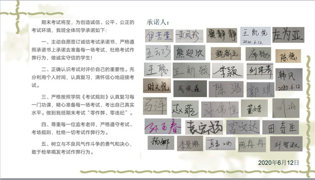 本次“用实力验证自我,以诚信构筑人生”主题团日活动活动顺利进行,各团支部应用各种形式带领同学们积极响应诚信考试的要求,尽快投入到期末考试复习状态,用诚信的执念抒写满意答卷。