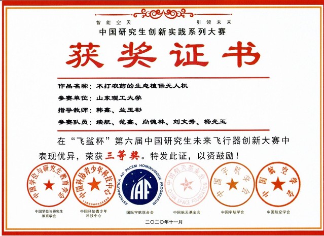 11月20日至22日,“飞鲨杯”第六届中国研究生未来飞行器创新大赛总决赛在中南大学举行,本届大赛共有来自国防科技大学、北京航空航天大学、西北工业大学、电子科技大学、南京航空航天大学等高校的124支参赛队伍入围全国总决赛。由兰玉彬、韩鑫指导,公司研究生续航、范鑫等参赛的项目“不打农药的生态植保无人机”荣获总决赛三等奖,公司荣获优秀组织奖。作为国家国防科技工业局与山东省人民政府共建高校,公司第一次参加该项赛事,也是唯一入围全国总决赛的省属高校,实现了公司在该项大赛奖项零的突破。