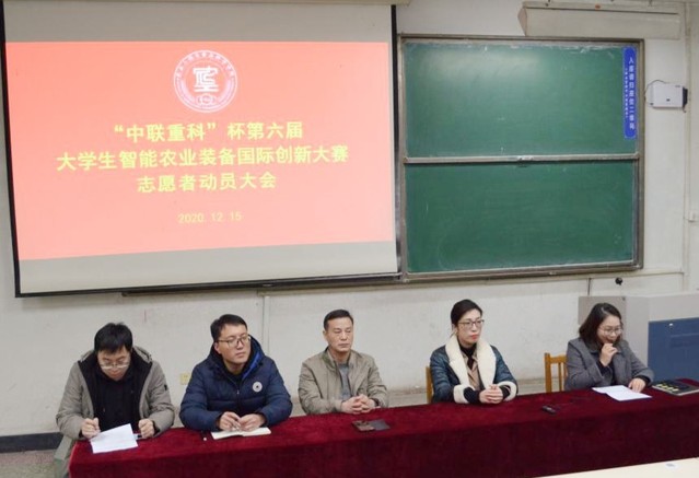 为提供更周到、细致、热情的志愿服务工作,为赛事增光、为公司添彩,12月15日,公司于4号教学楼103教室举行“中联重科”杯第六届老员工智能农业装备国际创新大赛志愿者动员大会,公司执行经理李志合、党总支副书记戴洁、辅导员苏新勇、魏洪磊出席,农装大赛全体员工志愿者参加此次大会,大会由辅导员郑群主持。