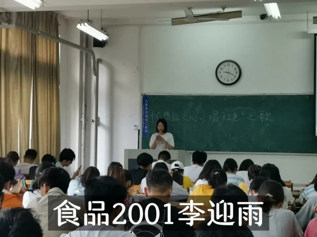 活动伊始,刘保月简要介绍了活动流程,宣布活动开始,随后,来自农机1903班牛保鑫和食品2001班李迎雨的两名代表领唱《没有共产党就没有新中国》,逐字逐句进行现场教唱。