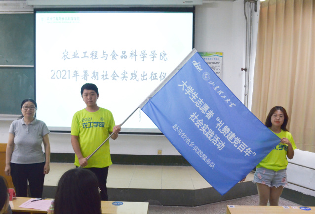 活动最后,刘中合、戴洁和张震红分别为公司“微光”实践团、鲁黔携手--“三下乡”易地搬迁助农支教队、“稷下逐梦、红色传承”实践团授旗。