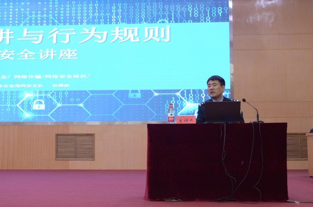 网安支队一大队副大队长孙国栋就网络谣言、信息保护、依法绿色上网、甄别谣言等内容进行了演示讲解,宣讲了大量网络安全知识,希望同学们在网上学习、娱乐时都能做到分辨真伪、谨言慎行、保护自己。