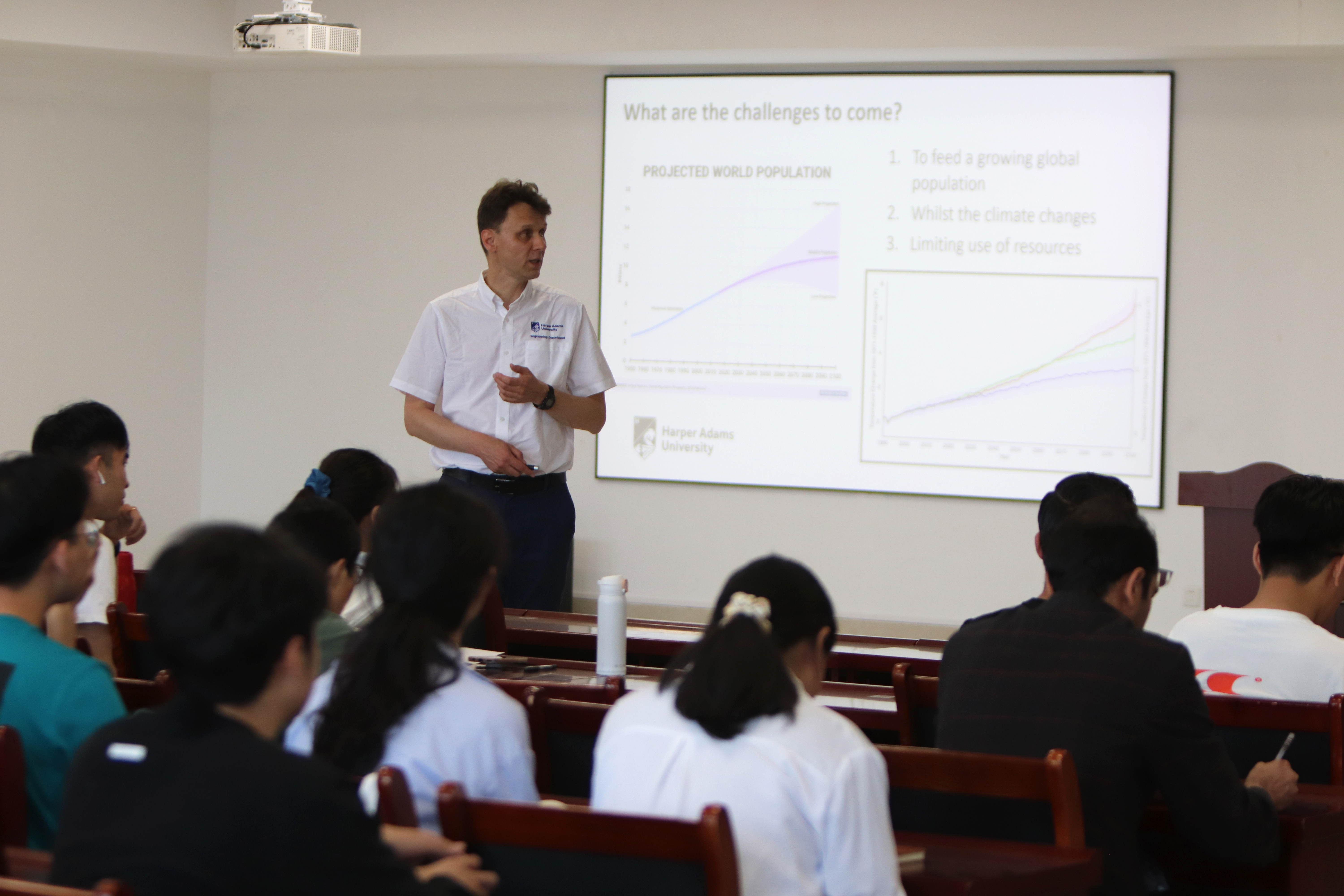 22日上午,斯文教授在6号农业工程大楼1109报告厅做了题为“How robots are redefining te future of farming”的学术报告,就英国哈珀亚当斯大学所倡导的小型农业机器人技术、无人农场(Hands-Free Farm)等进行了分享,讲解了农业发展面临的挑战、智慧农业的现状及发展趋势。在交流环节,与会师生与斯文教授进行了深入互动,斯文教授以他丰富的经验和专业知识对这些问题进行了解答,并分享了他在相关研究领域的见解和观点。