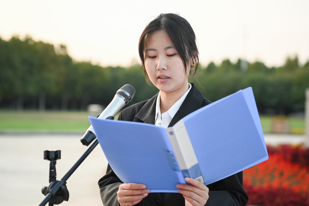 青年员工代表能源2101王浩带领全体青年团员重温入团誓词。国旗下,同学们激昂的声音在鸿远楼前回荡。
