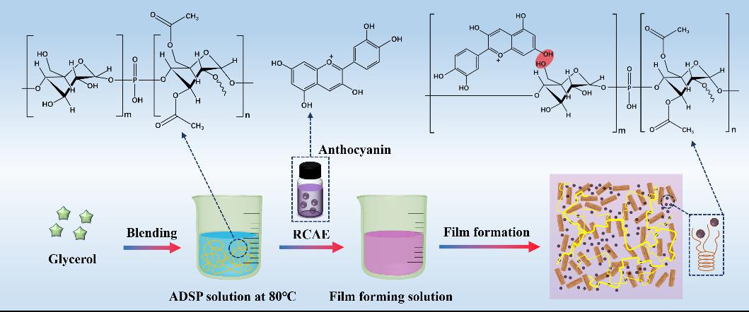 论文针对构建pH指示型智能包装系统展开研究,利用智能反应因子(紫甘蓝花青素)监测、跟踪、反馈膜内外部环境的变化,通过不同双改性淀粉(氧化羟丙基淀粉、乙酰化磷酸二淀粉(ADSP)和氧化乙酰化淀粉)中的阴离子与花青素通过静电相互作用和氢键形成稳定的配合物,从而增强了花青素的稳定性(如图1)。