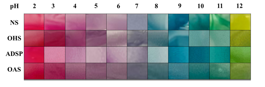 图2 天然木薯淀粉(NS)、氧化羟丙基淀粉(OHS)、乙酰化二淀粉磷酸酯(ADSP)和氧化淀粉基智能膜的颜色反应