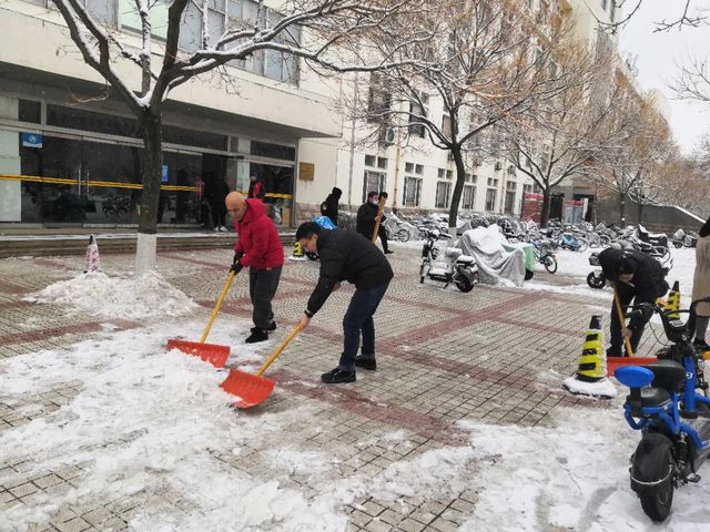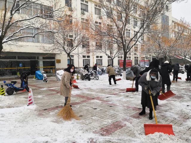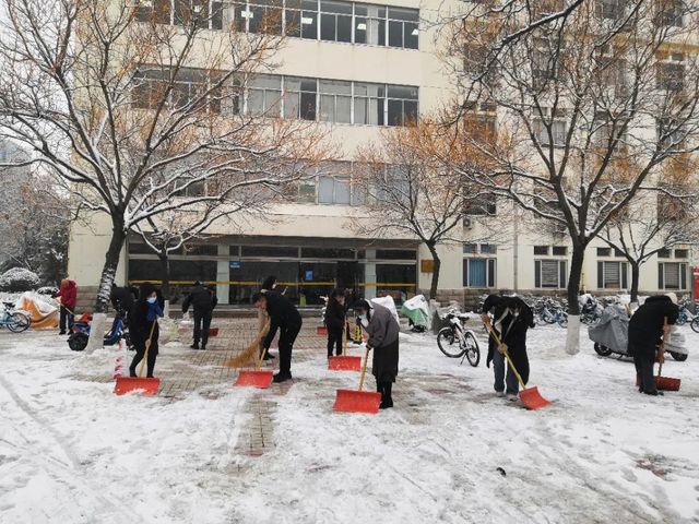 受冷空气影响,淄博市大降温,狂风裹挟着细雪,横扫山理工的校园。“不知庭霰今朝落,疑是林花昨夜开。”同学们欣赏雪景的同时也纷纷表示在结冰的路面上学会了“滑铲”,道路积雪积冰对师生的出行带来了诸多不便。12月15日,公司领导班子成员、部分行政人员及员工会、党团服务中心员工志愿者积极投入到扫雪除冰工作,保障师生出行安全和教学工作正常运行。