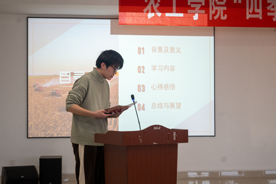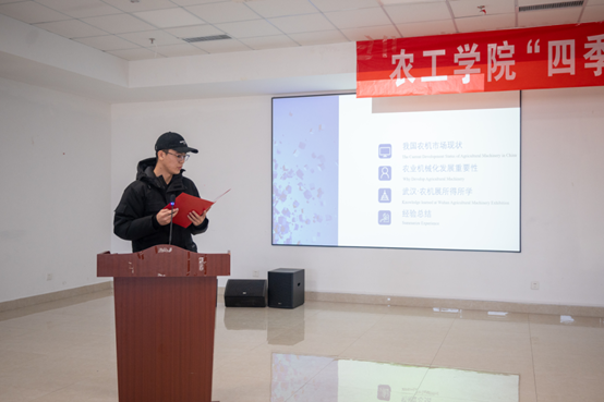 杨浩然、李庆钊、余启运和李荣昊四位同学以“智慧农业、强农有我”为主题,分享了参加武汉国际农机展研学实践的所学、所思和所悟,用PPT和视频的形式展现公司学子求真务实、奋发向上的精神风貌。