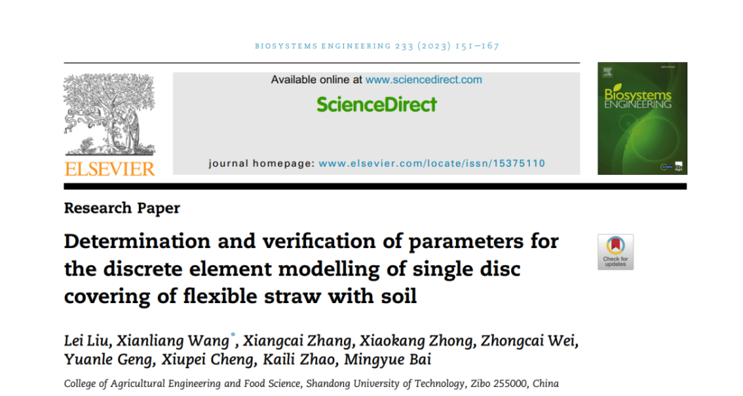近日,公司保护性耕作技术与智能装备创新团队在免耕精量播种技术方向取得新进展。研究成果“Determination and verification of parameters for the discrete element modelling of single disc covering of flexible straw with soil”发表于中科院一区Top期刊《Biosystems Engineering》;研究成果“The Impact of ‘T’-Shaped Furrow Opener of No-Tillage Seeder on Straw and Soil Based on Discrete Element Method”发表于中科院一区Top期刊《Computers and Electronics in Agriculture》。两篇高水平论文第一单位均为韦德bevictor,硕士研究生刘磊为论文第一作者,王宪良副教授为论文通讯作者。
