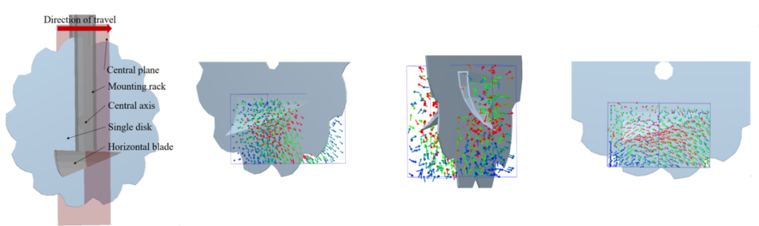 团队提出了黄淮海大秸秆量条件下低扰动免耕播种技术。在农业物料精准建模的基础上,在利用离散元模拟低扰动开沟器开沟过程方面取得了重要突破。在免耕播种系统中,开沟器开出“T”型槽可以最大程度保持土壤水分,确保种子始终被土壤覆盖。研究不同形式的横刀对于开沟器开出的“T”型横沟至关重要。该研究采用离散元法建立了“T”型槽开沟器-秸秆-土壤相互作用模型,通过土槽试验和仿真试验中多试验指标(土壤正向位移、侧向位移,秸秆正向位移,“T”型槽开沟器的牵引力、下压力)证明了模型的合理性。在探究试验中,考察了横刀的形状和工作速度对于“T”型槽开沟器性能的影响,在仿真中测量了牵引力、下压力、土壤位移和秸秆位移。