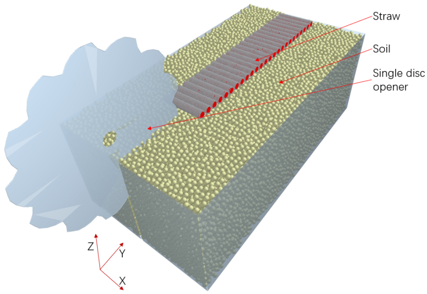 作物柔性体和复杂农田环境会降低免耕播种机作业可靠性。目前,解析农机部件-秸秆-土壤互作机理是设计优化免耕播种部件的依据,然而秸秆作为一种力学特性复杂典型柔性物料,缺乏准确可靠的建模方法。该团队构建了双层粘结模型对玉米秸秆进行离散元建模,并分别对柔性秸秆和土壤进行了离散元参数的标定,然后构建了柔性秸秆覆盖土壤的离散元模型,最终用单元盘-秸秆-土壤互作关系进行了模型准确性验证。利用所建的秸秆覆土模型进行单圆盘开沟器的切断秸秆并切土开沟的仿真实验和物理实验。该成果在农机部件-柔性秸秆-土壤互作机理方面取得了重要突破。