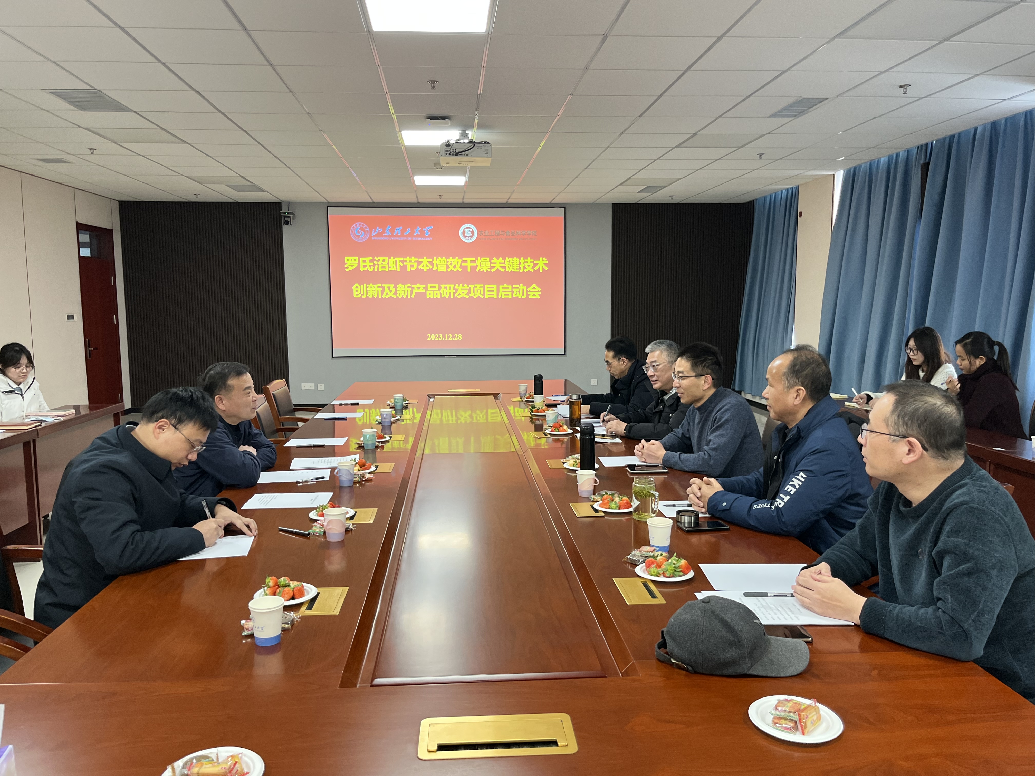 2023年12月28日下午,由江苏戚伍水产发展股份有限公司、江苏大学和韦德bevictor官网共同承担的江苏省重点研发计划“罗氏沼虾节本增效干燥关键技术创新及新产品研发”项目启动会在6号实验楼1109会议室召开。高邮市科学技术局黄翔副局长和石志荣科长、江苏戚伍水产发展股份有限公司居向东、江苏大学高瑞昌教授、公司执行经理李志合、副经理付鹏、石启龙及项目参与人员等参加会议。