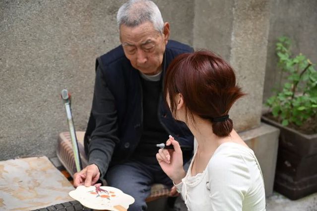 随后,党员们与老人一起绘制团扇,左手拿扇、右手拿画笔,让老人们在空白扇面上题字或画画。老人们或拿起马克笔仔细勾勒图形,填涂颜色,或拿起毛笔,行云流水,自然流畅的在团扇上书写,每幅作品都充分体现了他们对美好生活的热爱与向往。绘制结束,党员们将精心绘制的团扇赠予老人。