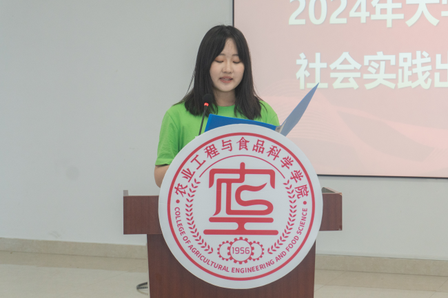 “田埂跳动”实践团员工代表发言,她代表即将出征的同学们向校团委、公司团委对社会实践的支持和关心致以感谢和敬意,并做出承诺:在实践过程中积极主动、团结协作,摆正心态、主动思考,遵守纪律、文明礼貌,展现积极向上的良好精神风貌。