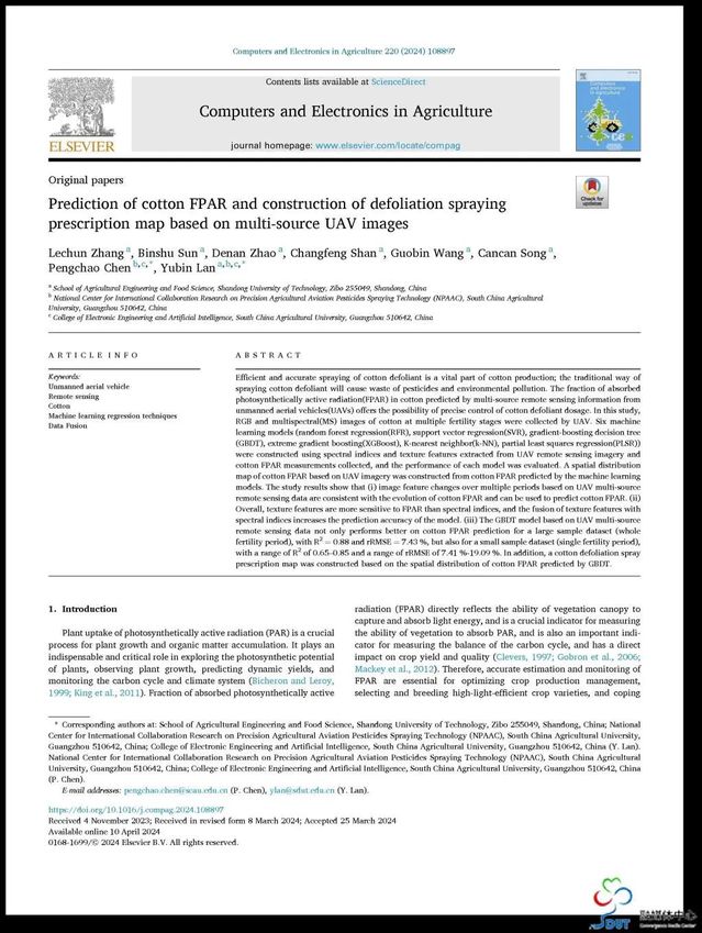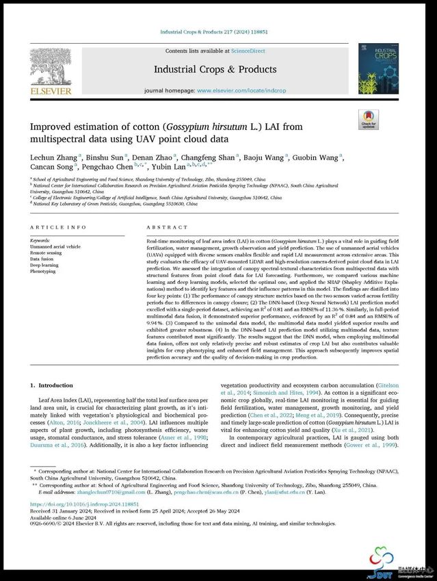 研究成果“Prediction of cotton FPAR and construction of defoliation spraying prescription map based on multi-source UAV images” 发表于期刊《Computers and Electronics in Agriculture》,以降低环境污染、提高农药利用率为目的对脱叶剂喷施处方图构建进行相关研究,基于多源无人机影像使用多种机器学习算法,对棉花的光合有效辐射吸收比例(FPAR)进行预测,并基于FPAR的空间分布进行脱叶剂喷施处方图构建。研究成果“Improved estimation of cotton (Gossypium hirsutum L.) LAI from multispectral data using UAV point cloud data” 发表于期刊《Industrial Crops and Products》,评估无人机搭载的激光雷达与高分辨率相机获取的点云数据在实时监测棉花的叶面积指数(LAI)预测中的效果,并且评估多光谱数据的冠层光谱纹理特征与点云数据的结构特征相结合在LAI预测中的效果,使用SHAP(Shapley加性解释)方法来识别该模型中的关键特征及其特征对预测值的影响模式。