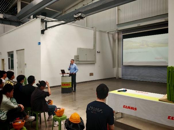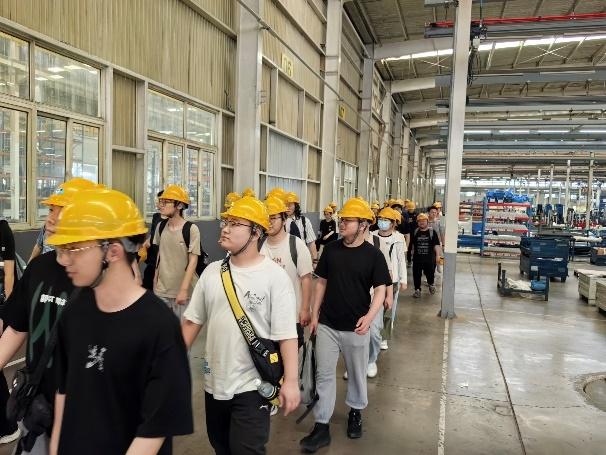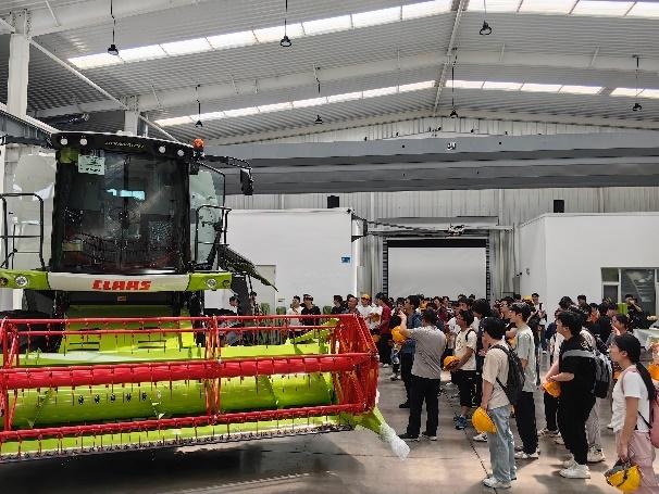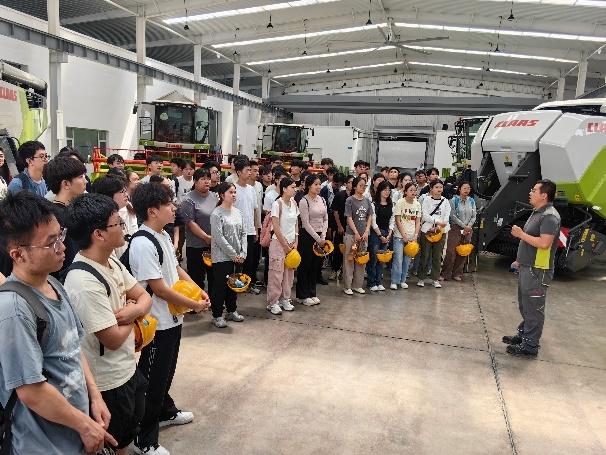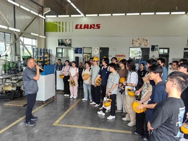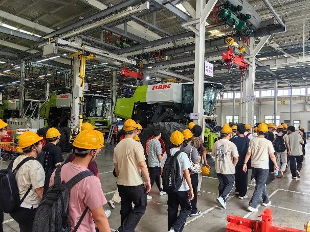 在工作人员的带领下,同学们观摩了科乐收收获机的装配线。从零部件加工到整机组装,近距离学习现代农机的制造流程与质量管理体系。企业工程师现场介绍收获机部件的加工工艺和装配流程,解答同学们的提问。此外,企业工程师向同学们介绍了科乐收的人才培养计划,鼓励员工积极参与科技创新。