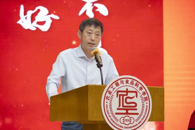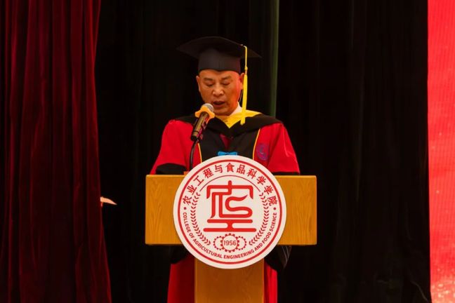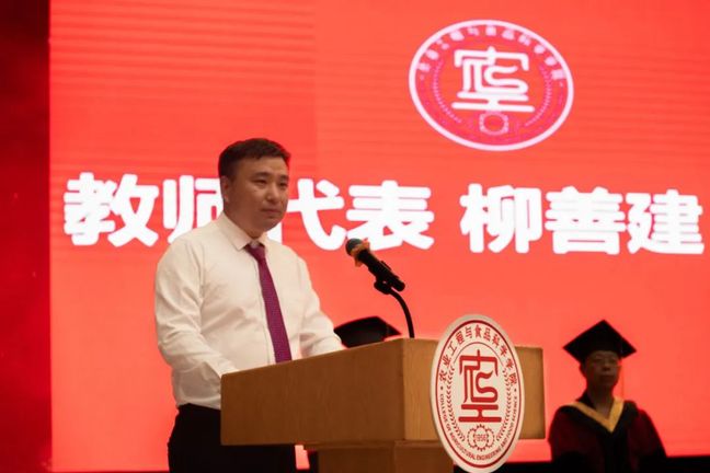 新能源科学与工程系柳善建代表教师发言,他结合各专业特点勉励毕业生以专业为基石、以信念为灯塔,在智慧农业、食品健康、绿色能源、创意设计行业为国家与社会贡献力量,他寄语员工要永葆生物质转化过程中“破壳重生”的勇气,保持“能量级联利用”的思维方式,拥有“碳中和”一样的人生态度,坚守初心做有担当的“农工人”。