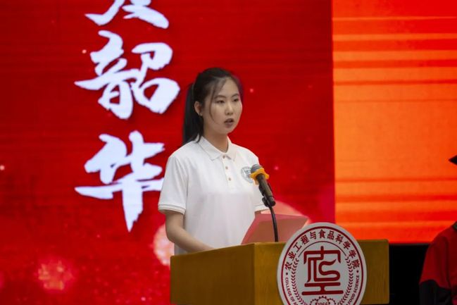 食品2101班陈佳慧代表毕业生发言,她代表全体毕业生感谢公司、老师的培育,她与大家一同回顾四年的学习生活和切身感受。她表示作为西部计划志愿者将始终铭记恩师教诲和公司期盼,以“农工人”的奋斗姿态走上工作岗位,用实际行动诠释青年人的责任与担当。