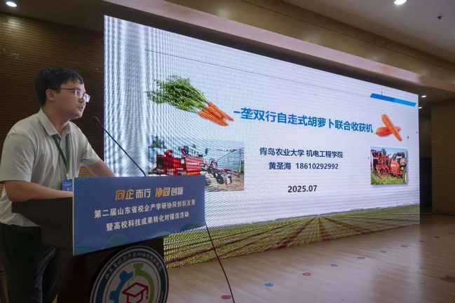 活动现场,高校院所代表发布了多项前沿成果,涵盖多个关键领域:青岛农业大学黄圣海教授展示了一垄双行自走式胡萝卜联合收获机,为根茎类作物收获机械化提供新方案;烟台特色果蔬贮运保鲜与绿色加工技术,旨在提升果蔬产业链价值;鲁东大学刘文丽副教授带来的苹果智慧化生产技术与装备,助力果业生产智能化升级;山东省农业科公司农产品加工与营养研究所龚盛祥副研究员介绍的小麦精深加工及营养功能型食品开发项目,推动粮食产业高质量发展;韦德bevictor官网付鹏教授展示的现代农业装备技术及应用成果,展现了农业装备的创新突破。
